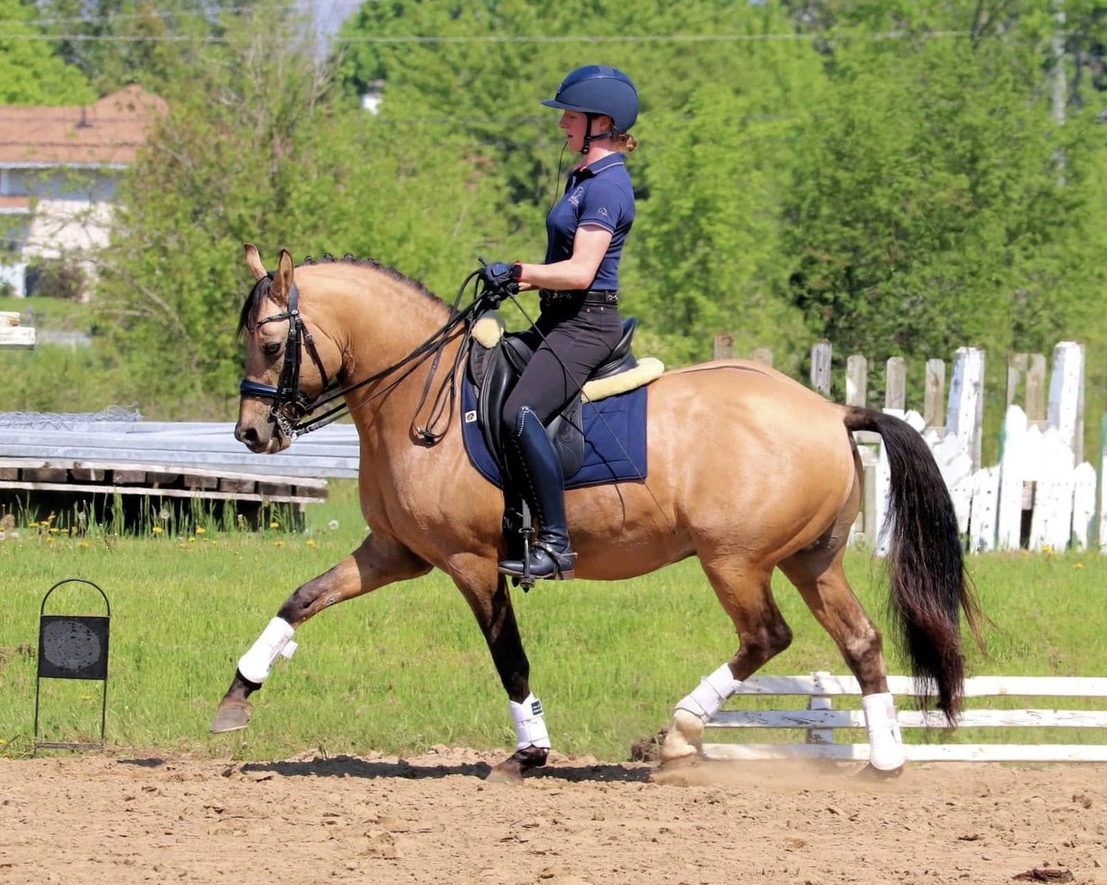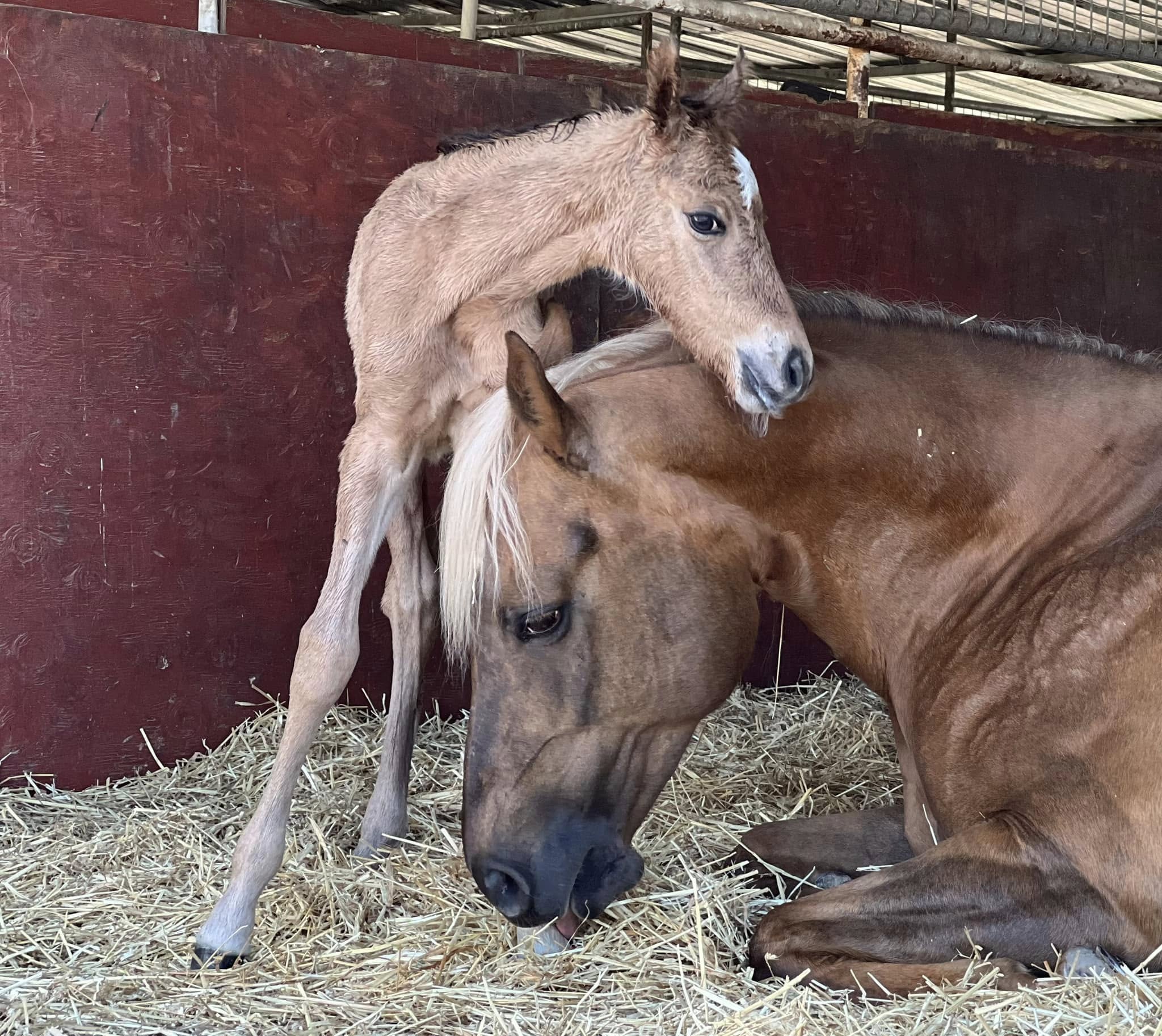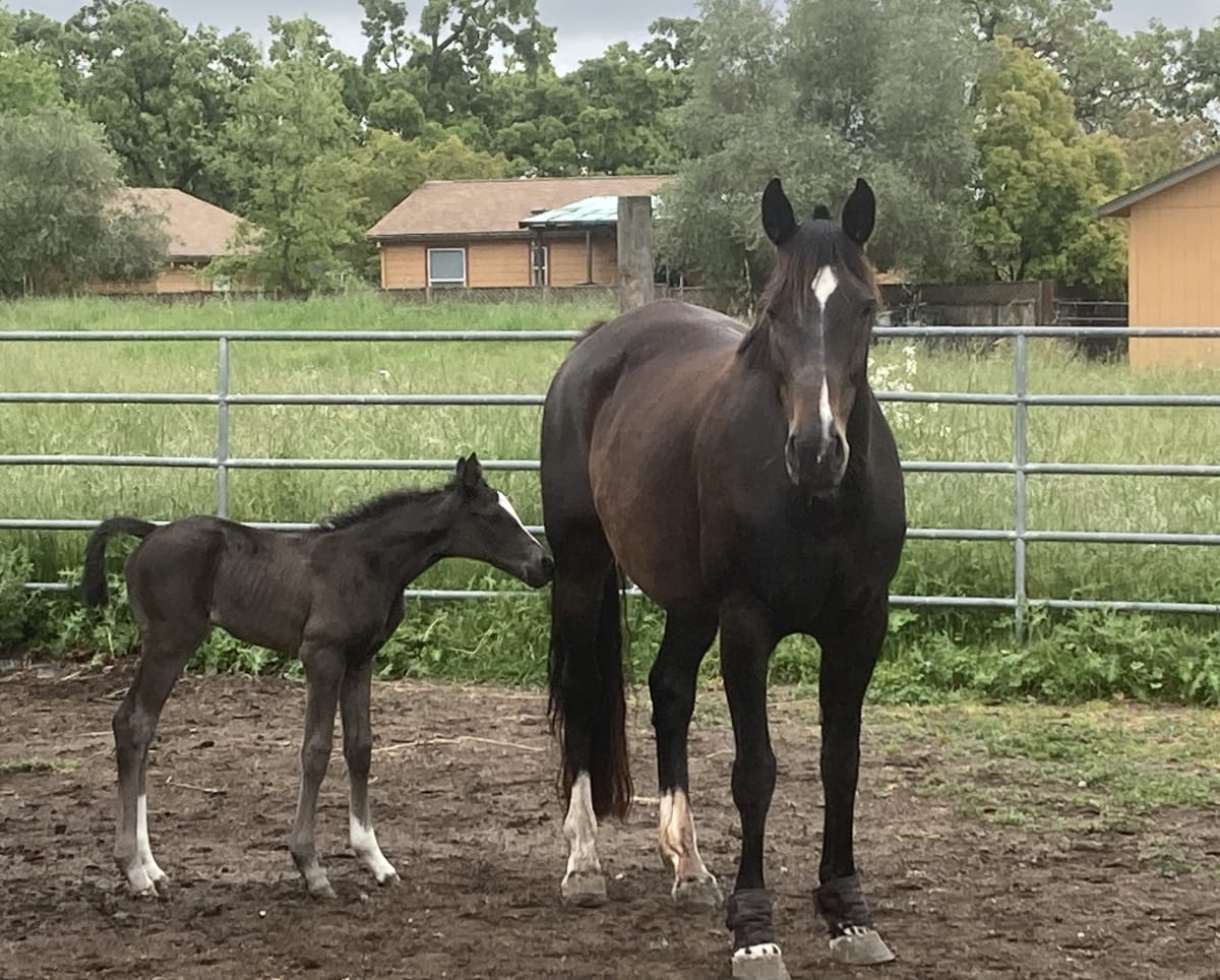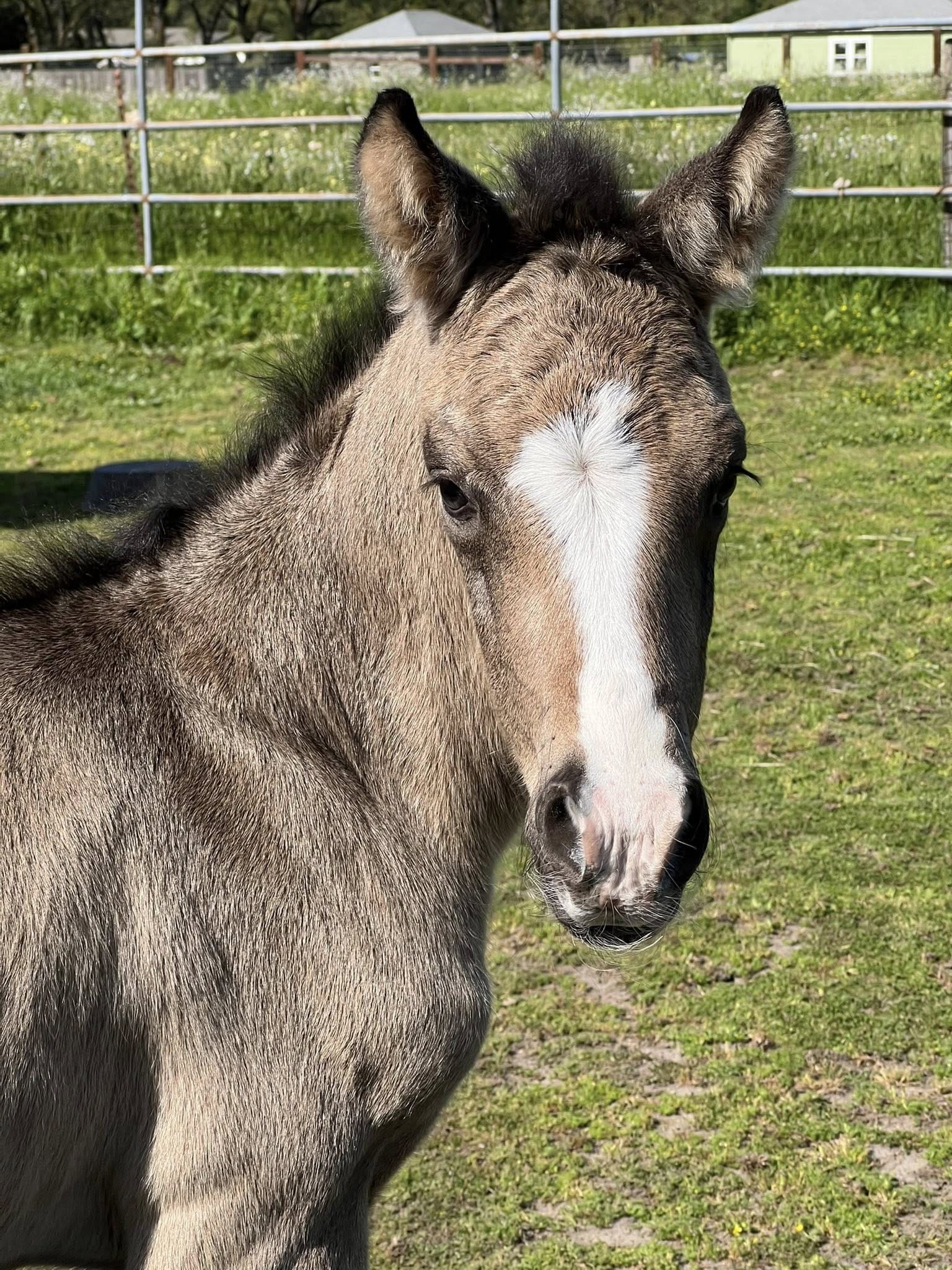 Disco is a bay dun colt born April 2nd, 2024. His sire is German riding pony Deja D’or, showing 4th level dressage with +70% scores. His dam is Mocha, an AQHA palomino quarter horse mare, who has shown 2nd level dressage scoring 7s at all three gaits.